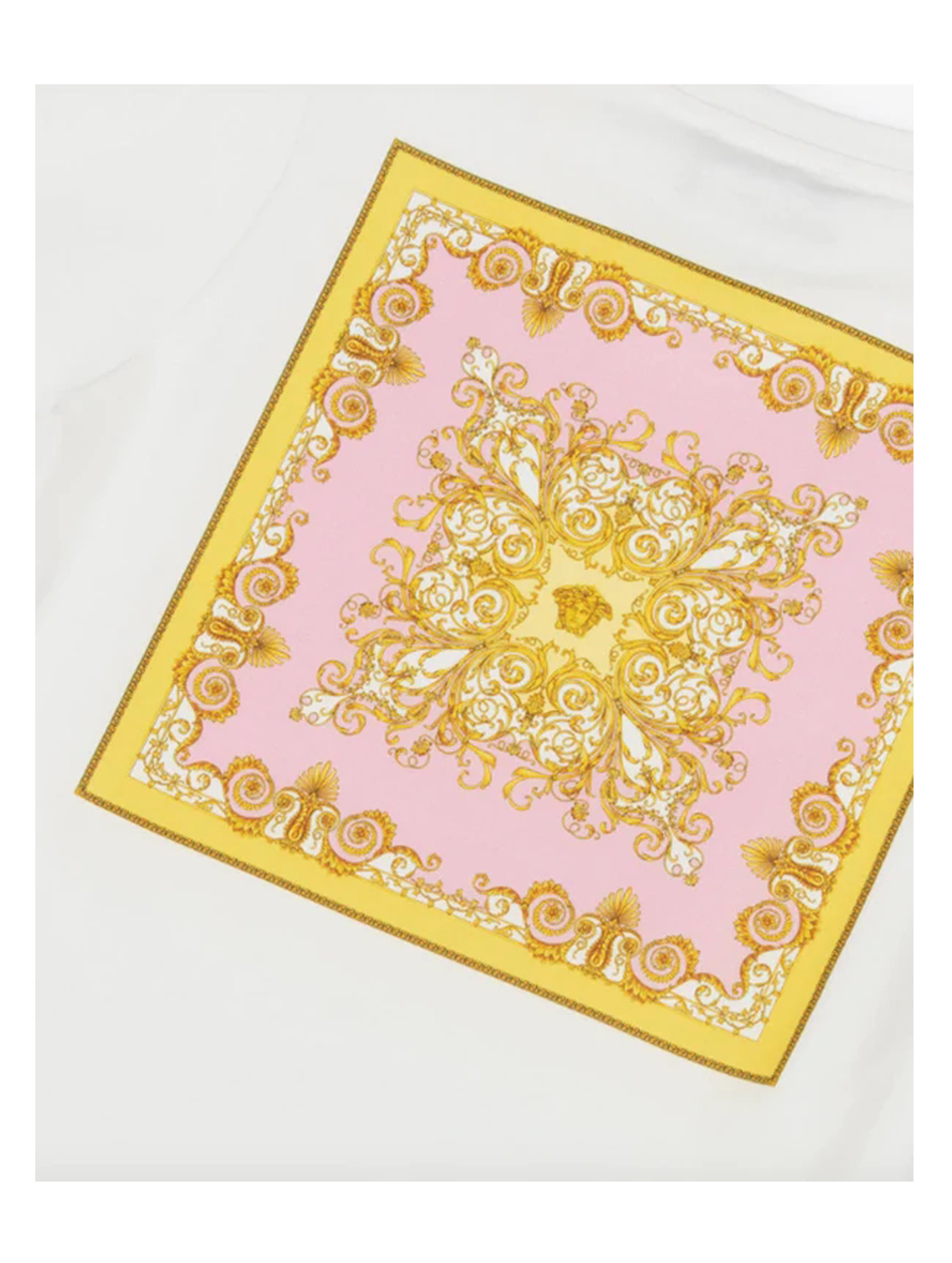 T-shirt a maniche corte realizzata in jersey di cotone, con scollo rotondo, a tinta unita, con piccolo logo a contrasto sul davanti e con una vivace grafica Versace Barocco a foulard stampata sul retro. Per un look trendy e fashion. VERSACE