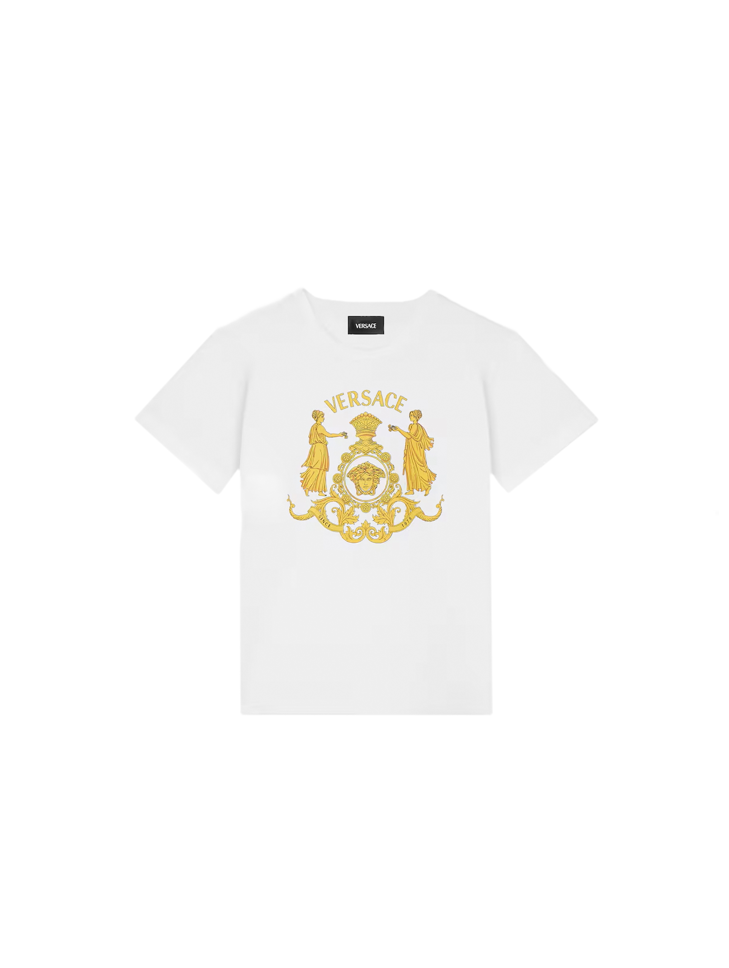 T-shirt a maniche corte realizzata in jersey di cotone, con scollo rotondo, a tinta unita, impreziosita da una straordinaria grafica Hall of Heroes Crest sul davanti. Per un look trendy e fashion. VERSACE