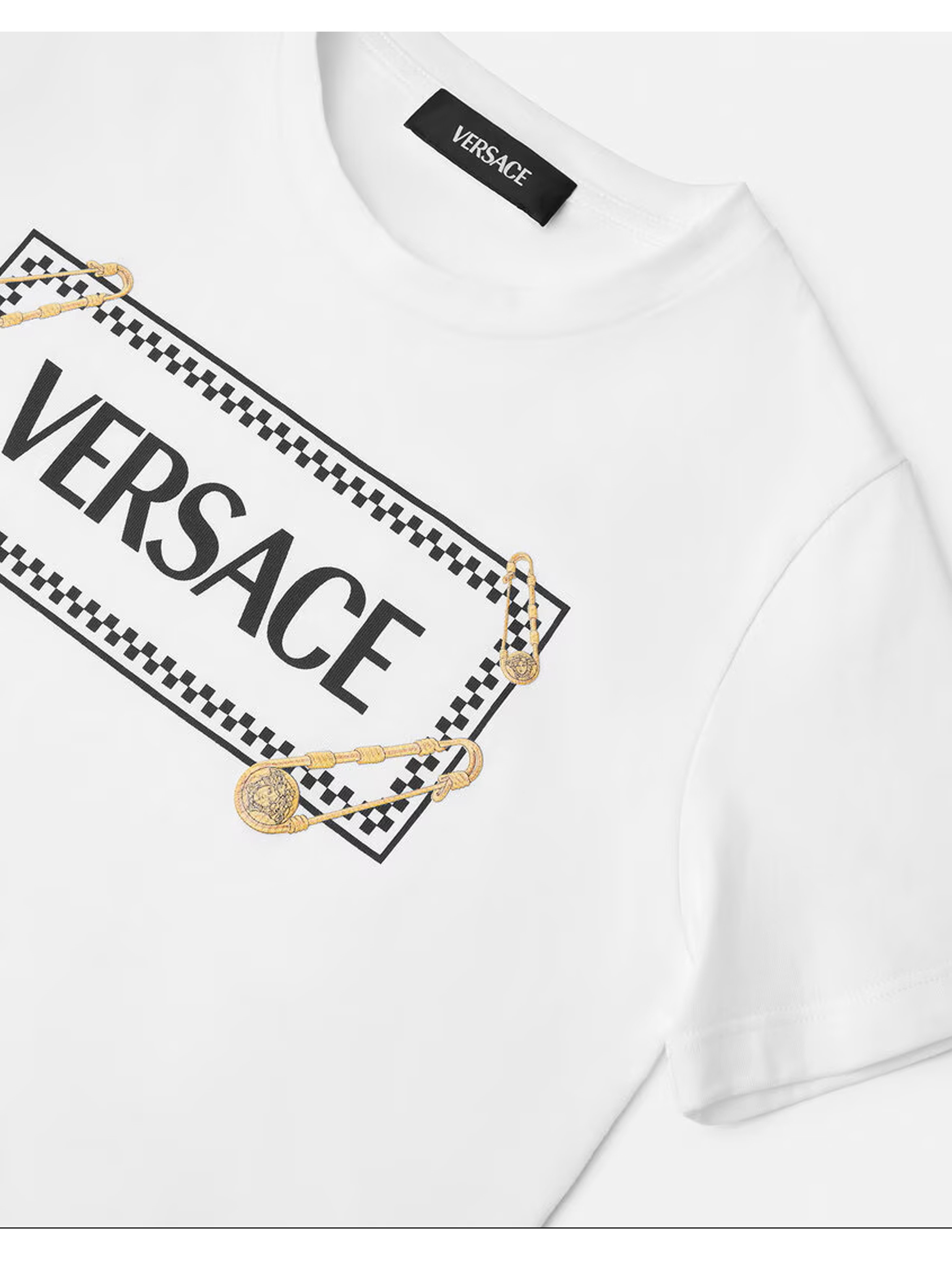 T-shirt in jersey a maniche corte, con scollo rotondo, a tinta unita e riquadro con grafica e logo letterign stampato a contrasto sul davanti. Per un look trendy e fashion. VERSACE