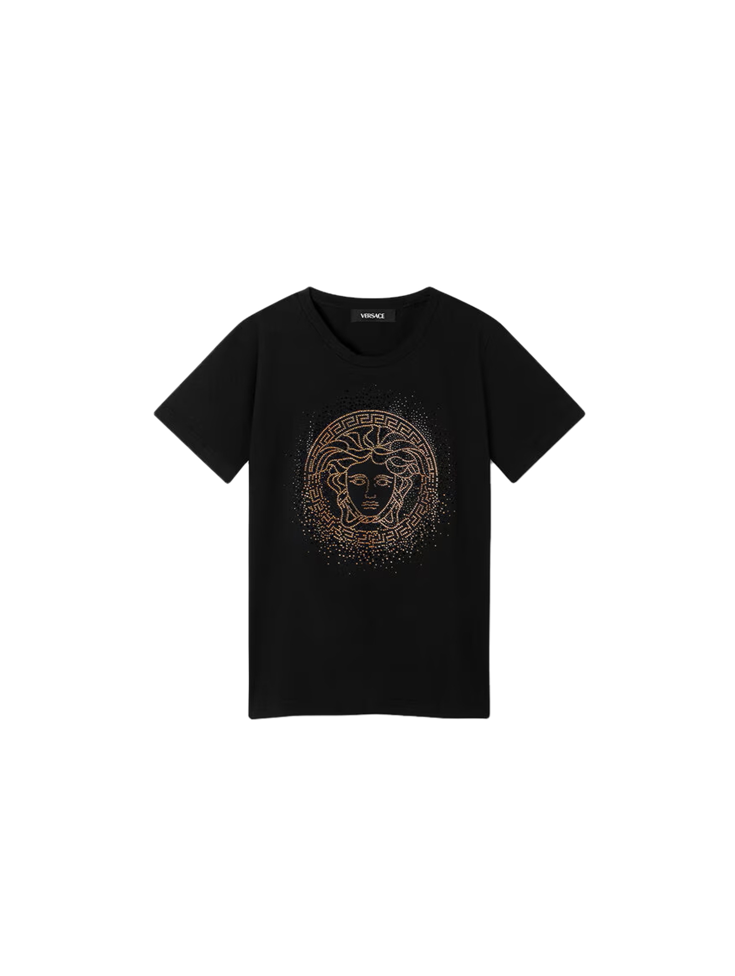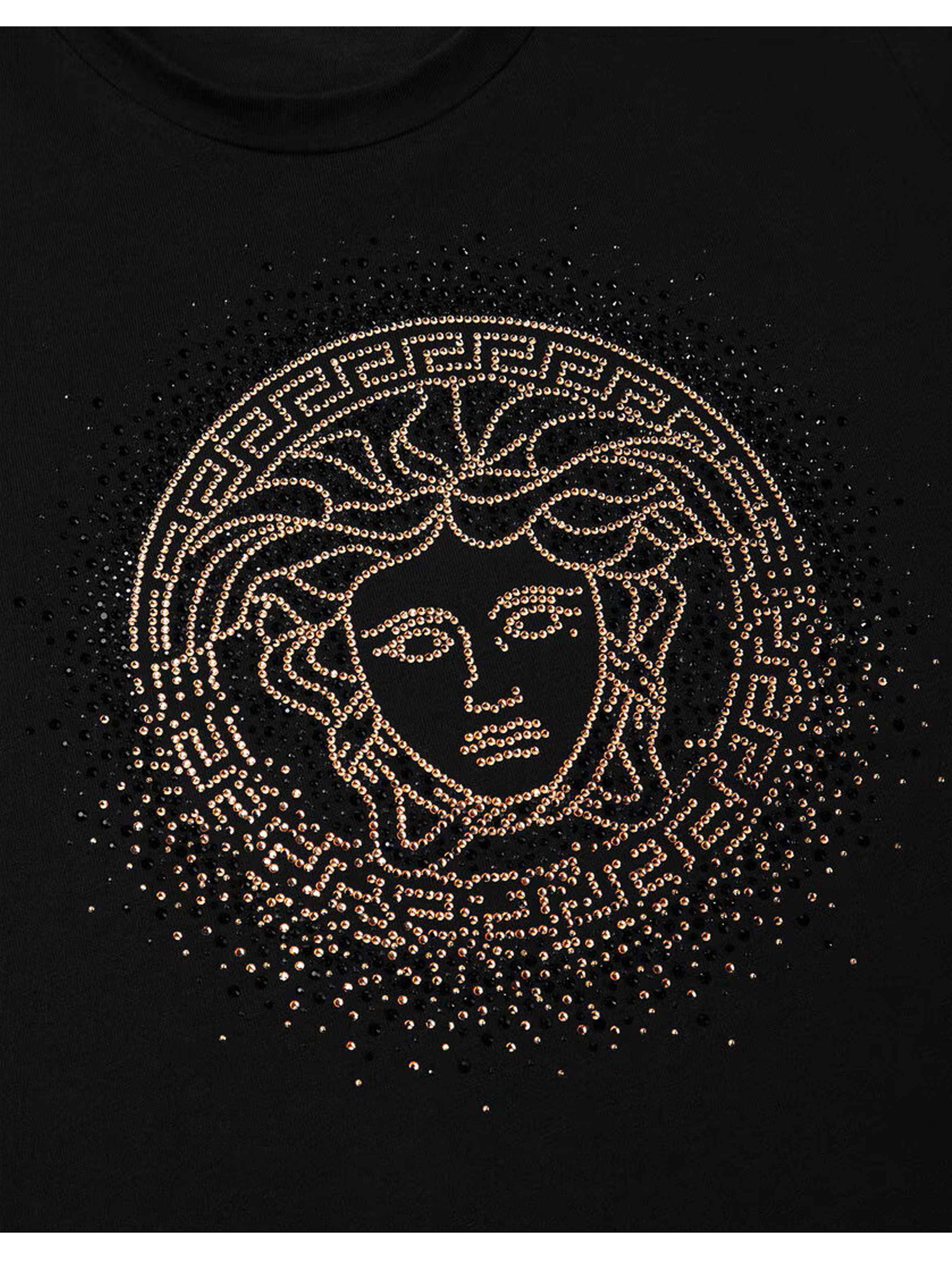 T-shirt in jersey a maniche corte, con scollo rotondo, a tinta unita e iconica testa di Medusa con cornice greca fatti di strass sul davanti. Per un look trendy e fashion. VERSACE