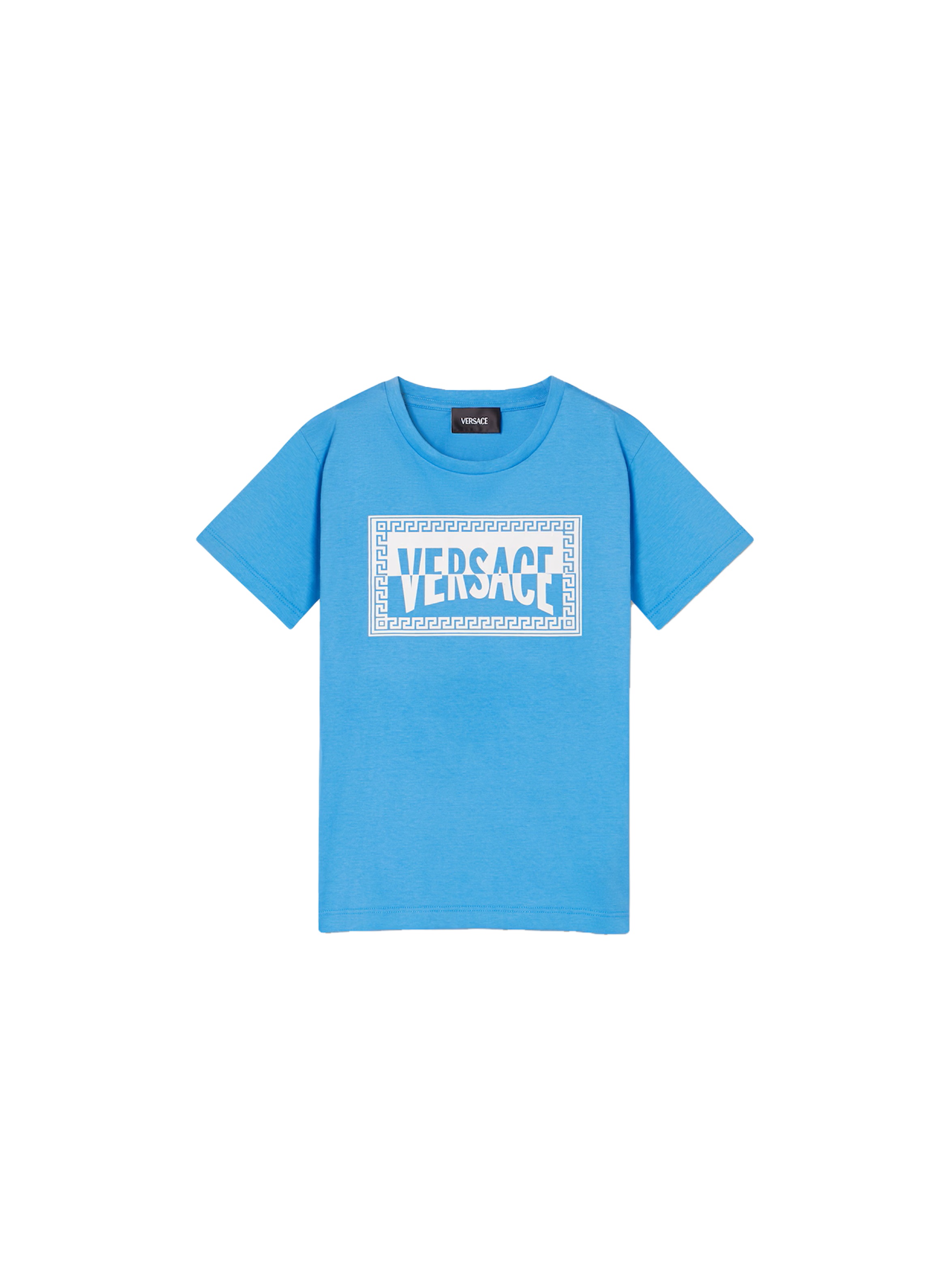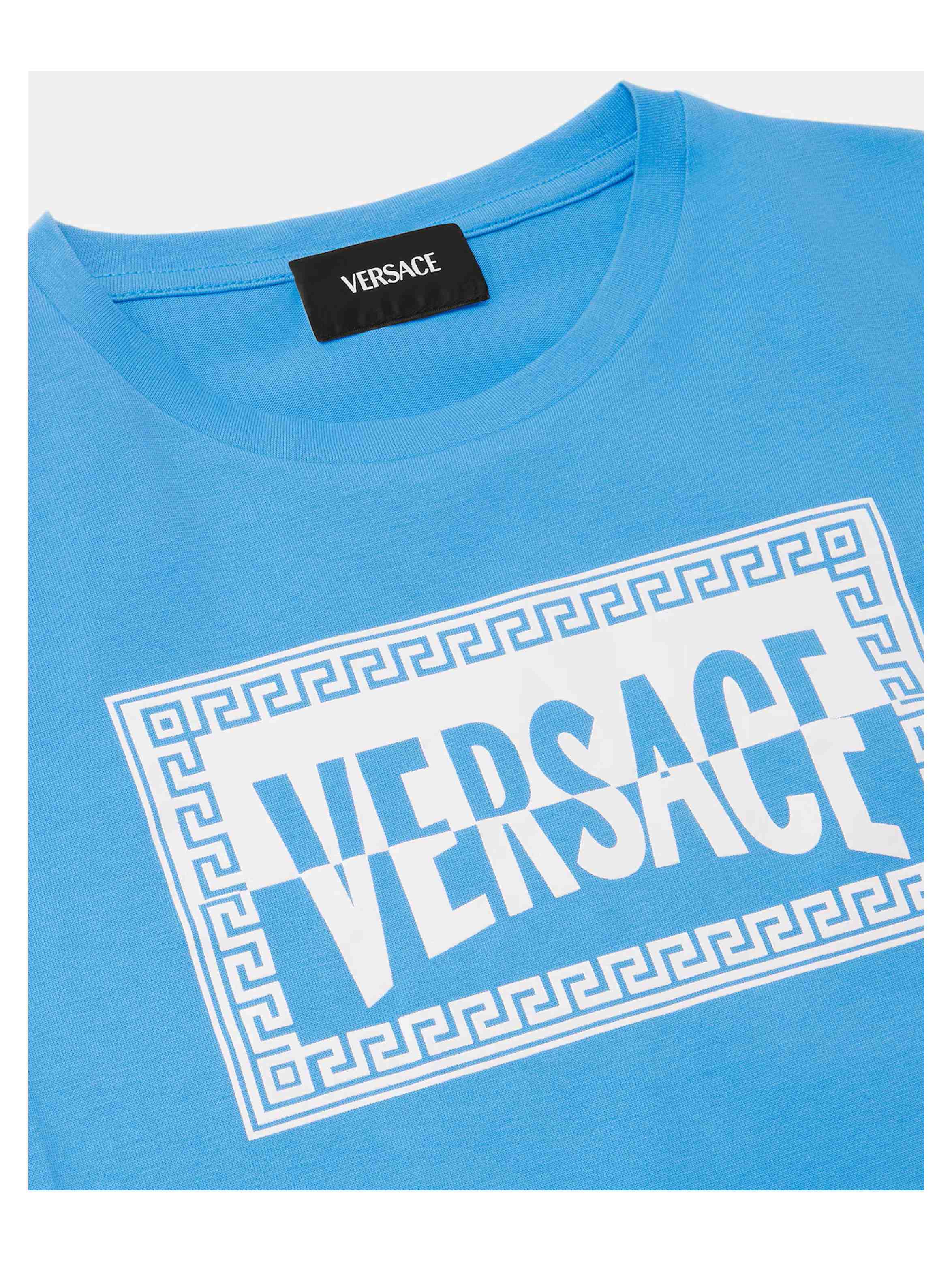 T-shirt a maniche corte in confortevole jersey di cotone, con scollo rotondo, a tinta unita e con maxi grafica Etichetta Club con logo bicolor sul davanti. Per un look casual e trendy. VERSACE